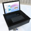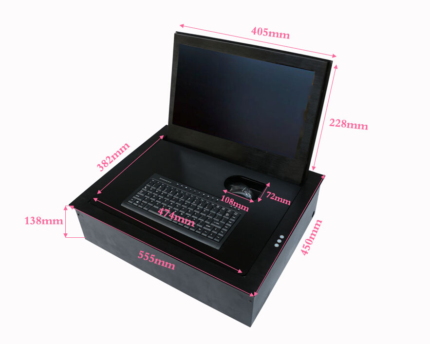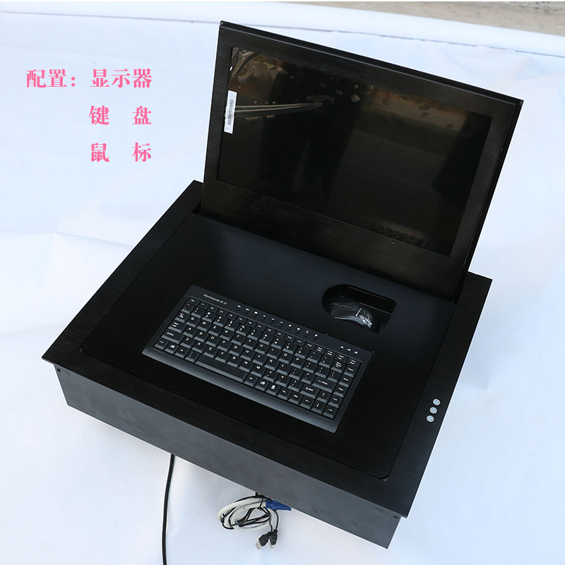 当打开翻转器时液晶显示屏会自动翻转成105度角度(特殊要求也可以另行设计),键盘鼠标也同时会自动升起与桌面齐平,当不使用时,显示屏可自动翻转隐藏于桌面内部,产品具有防盗、防尘保持桌面平整,美化桌面等功能。